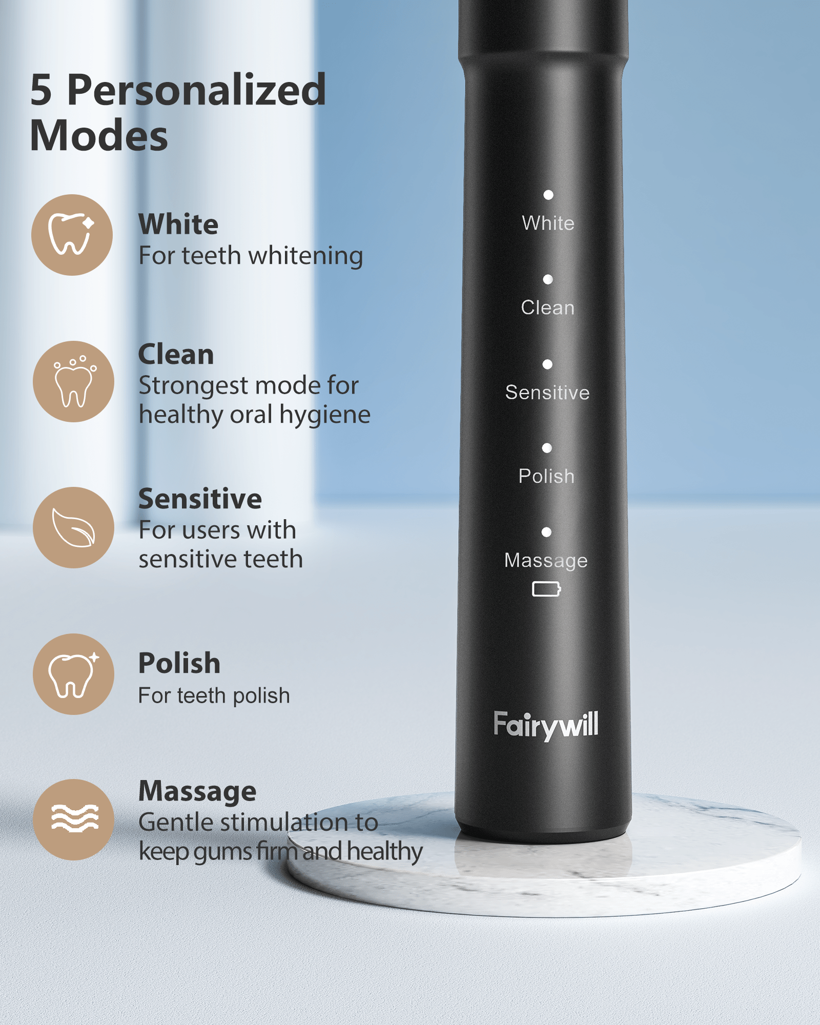 مسواک برقی فایرول با وزن سبک 60 گرمی و طراحی خاص خود در 5 حالت مختلف (1سفید کردن 2تمیزکردن 3پولیش دندان 4ماساژ 5مسواک دندان و لثه حساس) قابل تنظیم است، این قابلیت تنظیم حالات، مسواک را برای انواع دندانها و لثهها و حتی لثههای حساس کودکان قابل استفاده کرده است. با استفاده از مسواک پرقدرت Fairywill با فناوری پیشرفته 40000 لرزش در دقیقه احساس جرمگیری دندانهایتان را بعد از هر استفاده خواهید داشت. از ویژگیهای دیگر این مسواک میتوان صدای بسیار کم، ضدآب، قابل استفاده بودن در حمام و همچنین تایمر هوشمند دو دقیقه ای برای مدیرییت زمان مسواک زدن طبق توصیه دندان پزشکان نام برد.